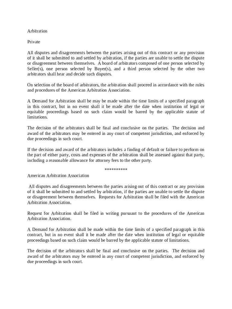 Example of clauses regarding Arbitration when disputes happen in regards to a lease and/or property. This clause lays out elements of arbitration requirement.