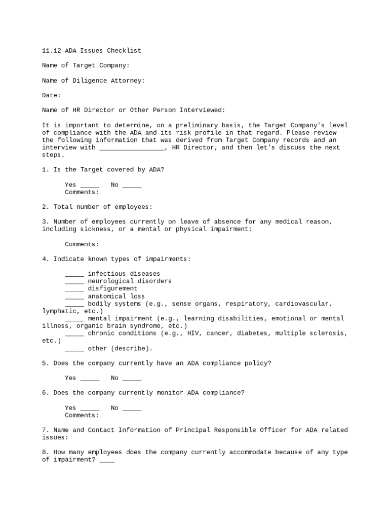 This due diligence checklist is used to determine the company_x0019_s level of compliance with the ADA and its risk profile in regards to business transactions.