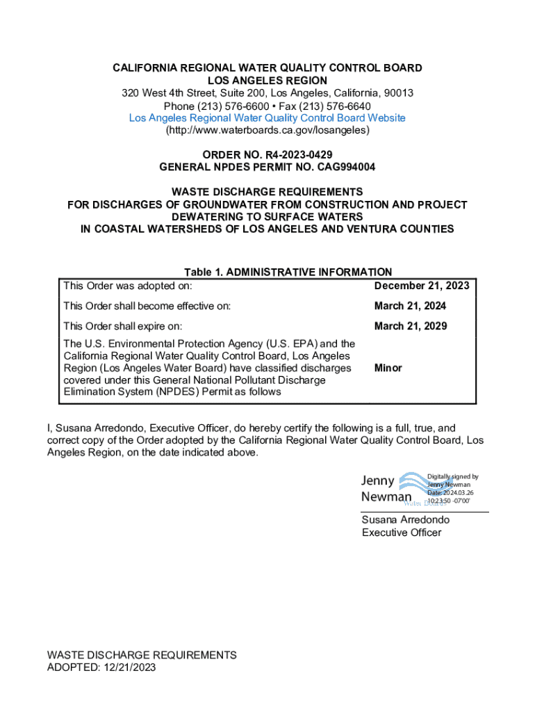 This Order establishes general waste discharge requirements for discharges of groundwater from construction and project dewatering to surface waters in coastal watersheds of Los Angeles and Ventura