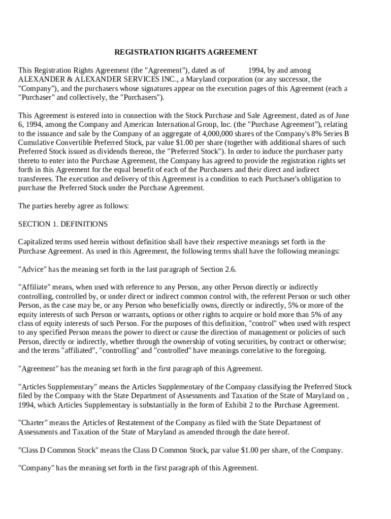 Get the free Registration Rights Agreement between Alexander and Alexander Services, Inc. and Pur...