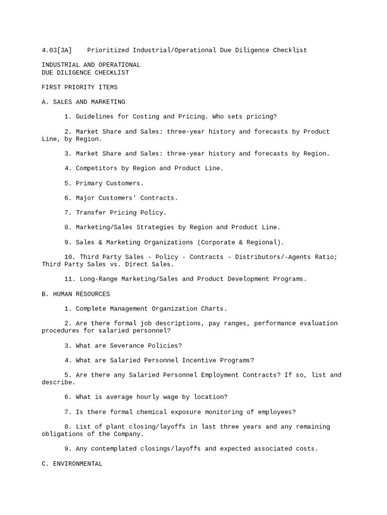 Get the free Prioritized Industrial Operational Due Diligence Checklist template