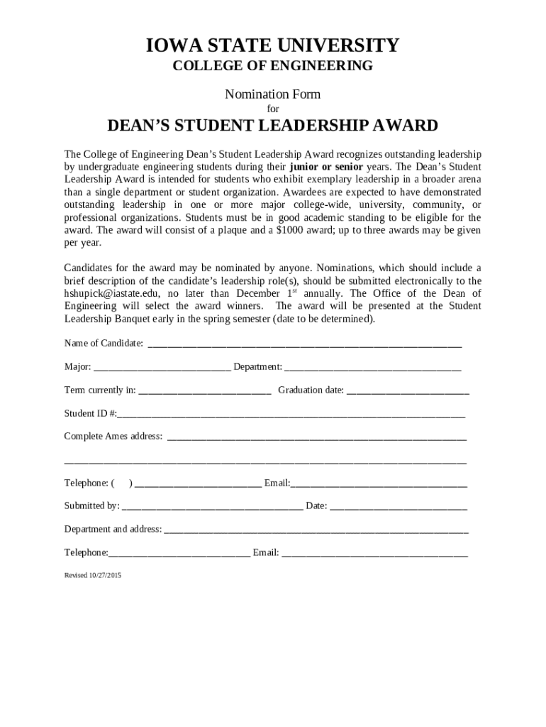 Instructions for the form Nomination for Dean's Student Leadership Award
