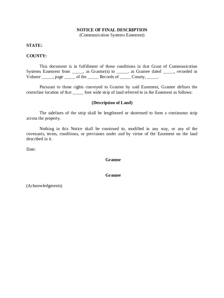 A notice of final description form serves as a crucial document in establishing easements related to communication systems. It outlines the legal description of the property and the specific rights granted to the parties involved. Accurate completion of this document is essential to prevent potential legal complications.