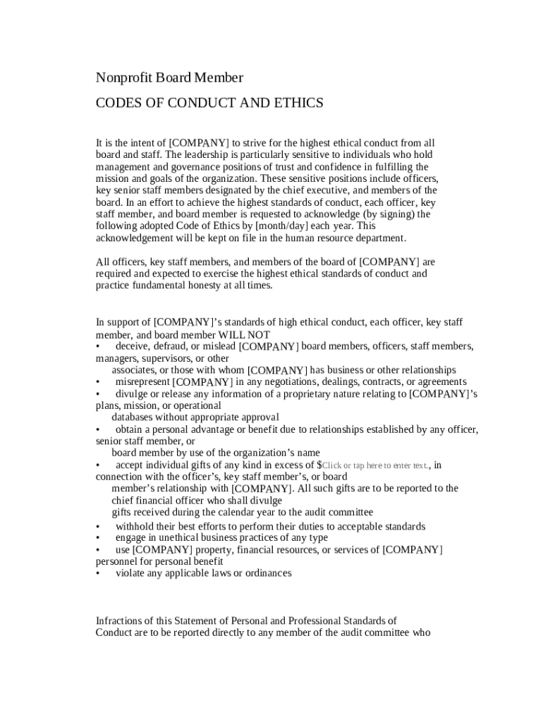 A Code of Conduct serves as a foundation for ethics and governance within nonprofit organizations. It defines expected behaviors, ensuring all members align with the organization’s values and mission. Adhering to ethical standards not only enhances internal cohesion but also fosters public trust, significantly impacting organizational integrity.