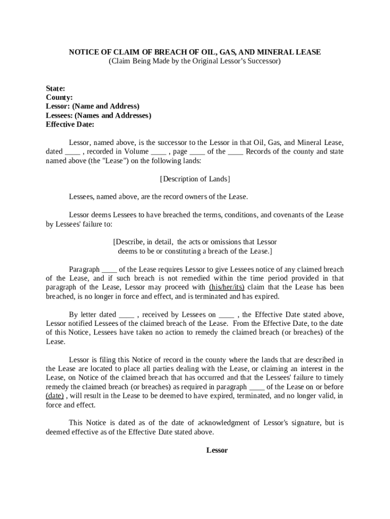 Get the free Notice of Claim of Breach of Oil, Gas, and Mineral Lease by the original Lessor's Su...