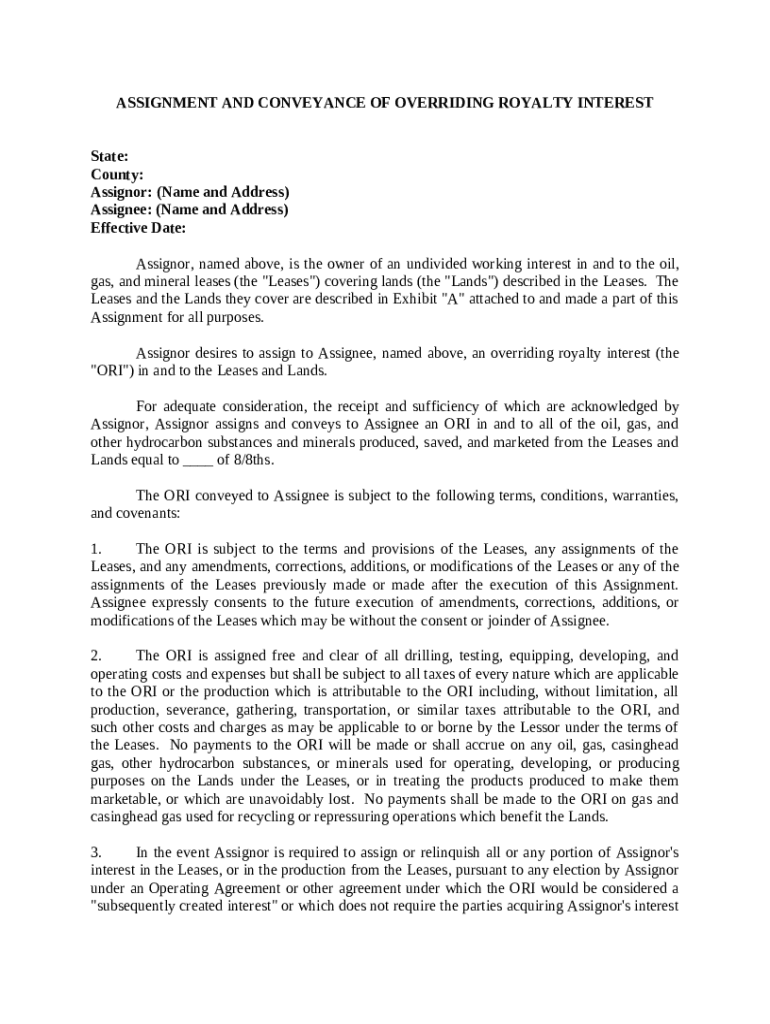 Key terms include Assignor (the original party), Assignee (the new party), and Overriding Royalty Interest (ORI) which represents a share in production revenues.