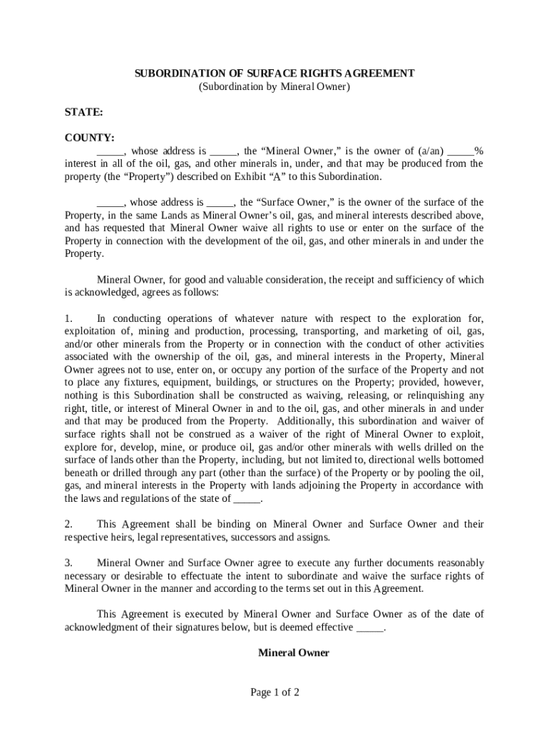 This form is a subordination of surface rights agreement with subordination by mineral owner.