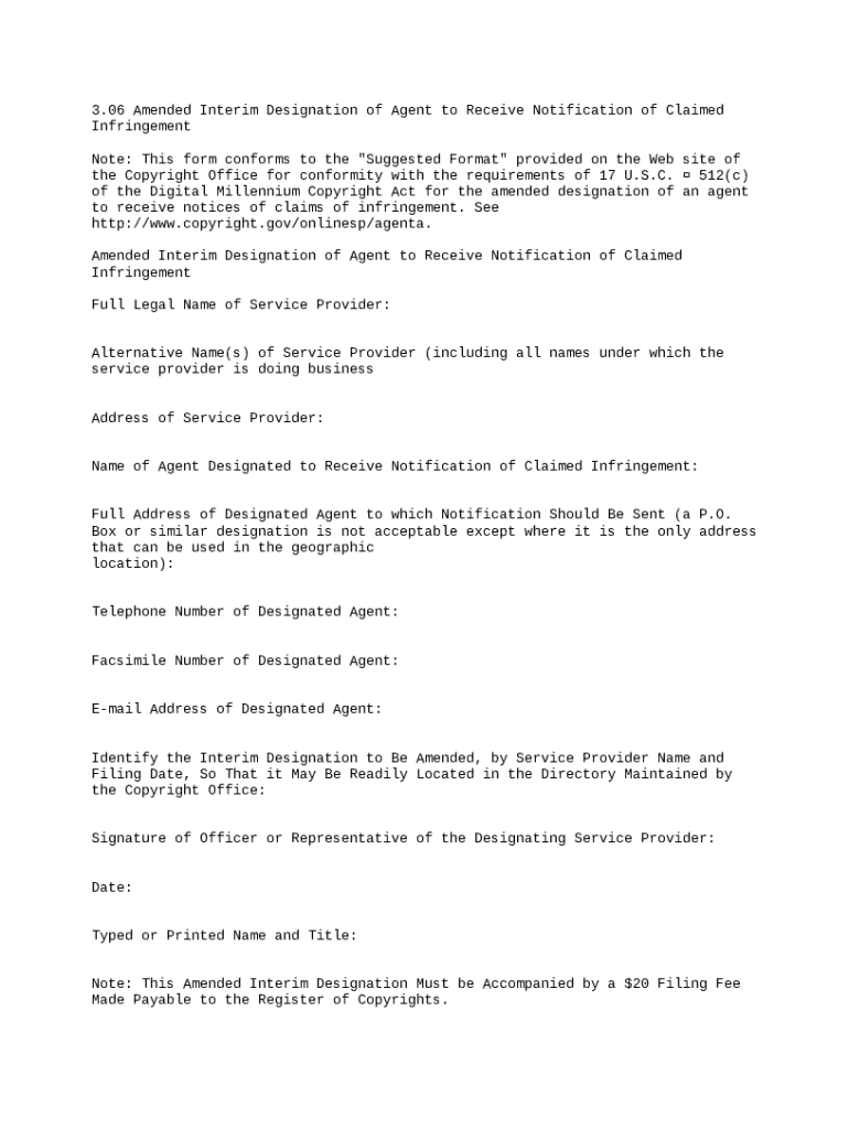 Get the free Amended Interim Designation of Agent to Receive Notification of Claimed Infringement...