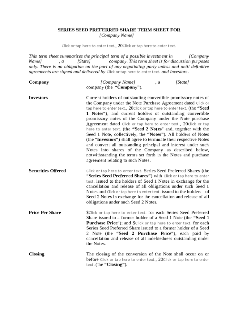 Get the free Term Sheet - Series Seed Preferred Share for Company template