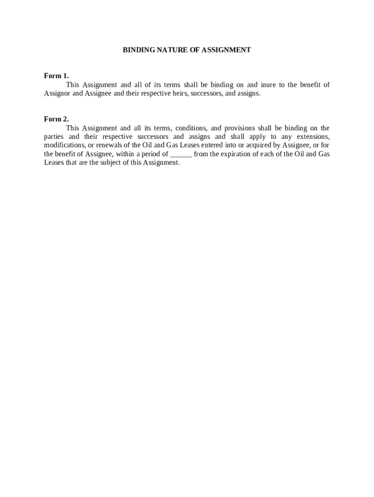 The Binding Nature of Assignment form, is for the binding of assignment between the Assignment and all of its terms to the benefit of assignor and assignee and their respective heirs, successors,