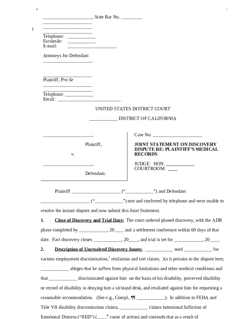 Get the free Joint Statement on Discovery Dispute template