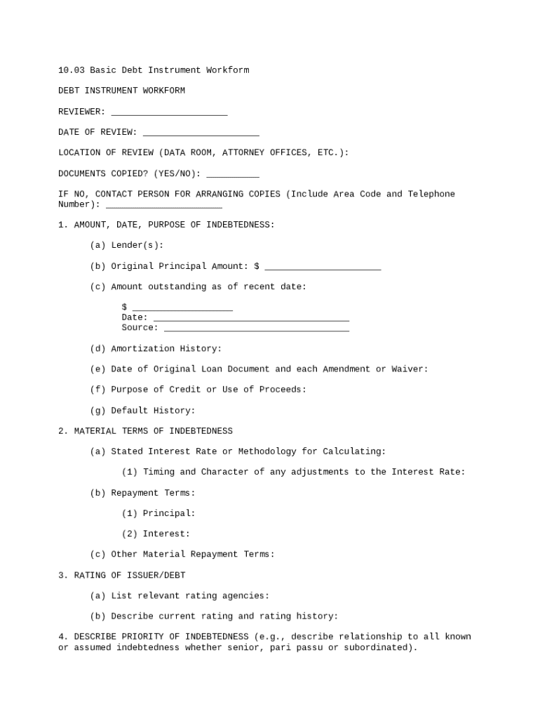 A basic debt instrument workform is a template used to document the terms and conditions of a debt agreement between parties.