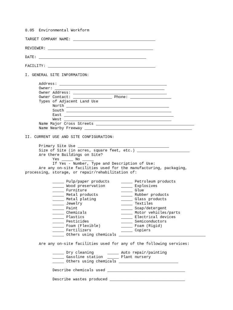 This due diligence workform is used to document company procedures and regulations for environmental information in business transactions.
