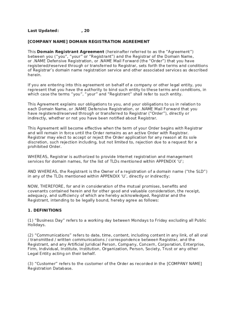 This agreement is a formal contract that delineates the terms under which a domain name is registered, highlighting both parties' roles.