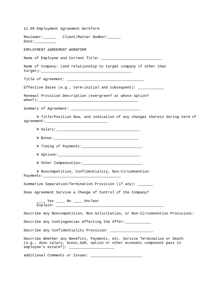 This due diligence workform is used to document new employee information, job title, and employment provisions in business transactions.