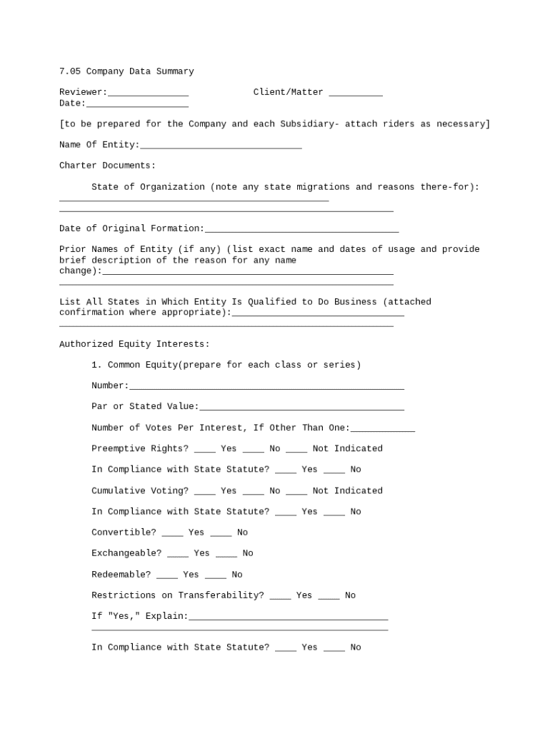 This form is a due diligence data summary to be prepared for the company and each of its Subsidiaries in business transactions.