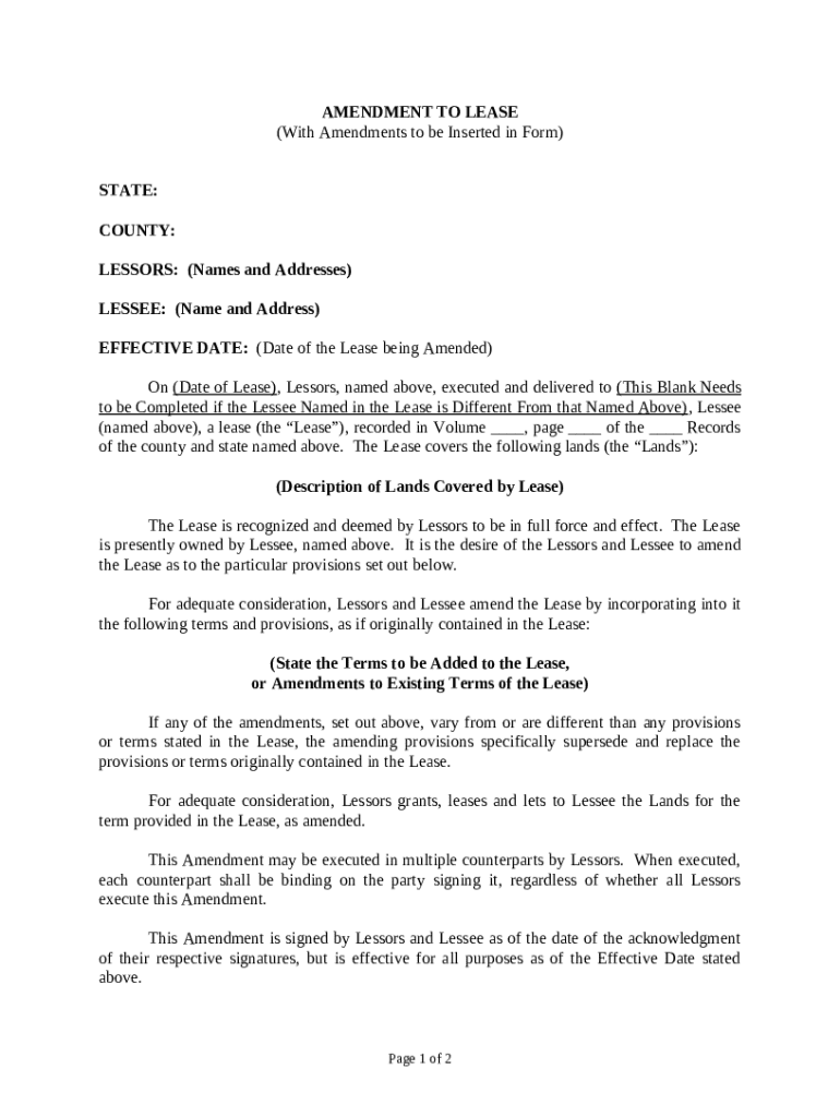 An amendment to an oil and gas lease is a legal document that modifies the terms of an existing lease agreement. These amendments are crucial for adapting to changing circumstances or addressing new agreements between lessors and lessees. Understanding the amendment process is essential for all parties involved in oil and gas leasing, as it ensures clarity and legality in the ongoing business relationship.