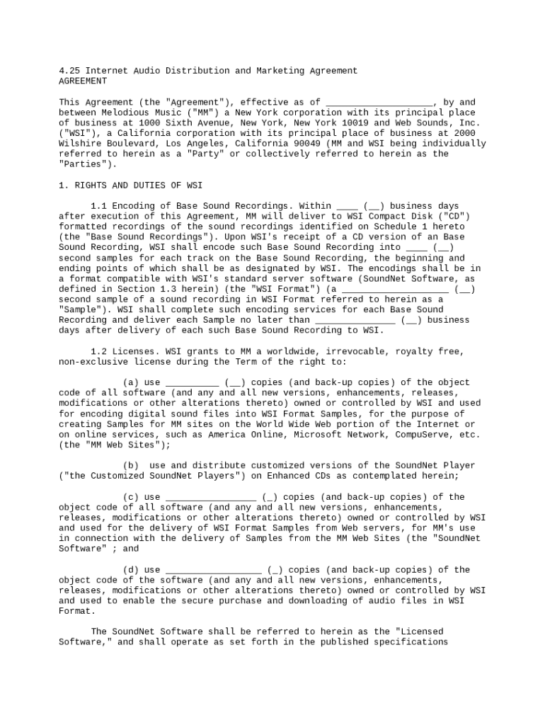 For example, agreements between a content creator like Melodious Music MM and a distribution platform like Web Sounds Inc WSI.