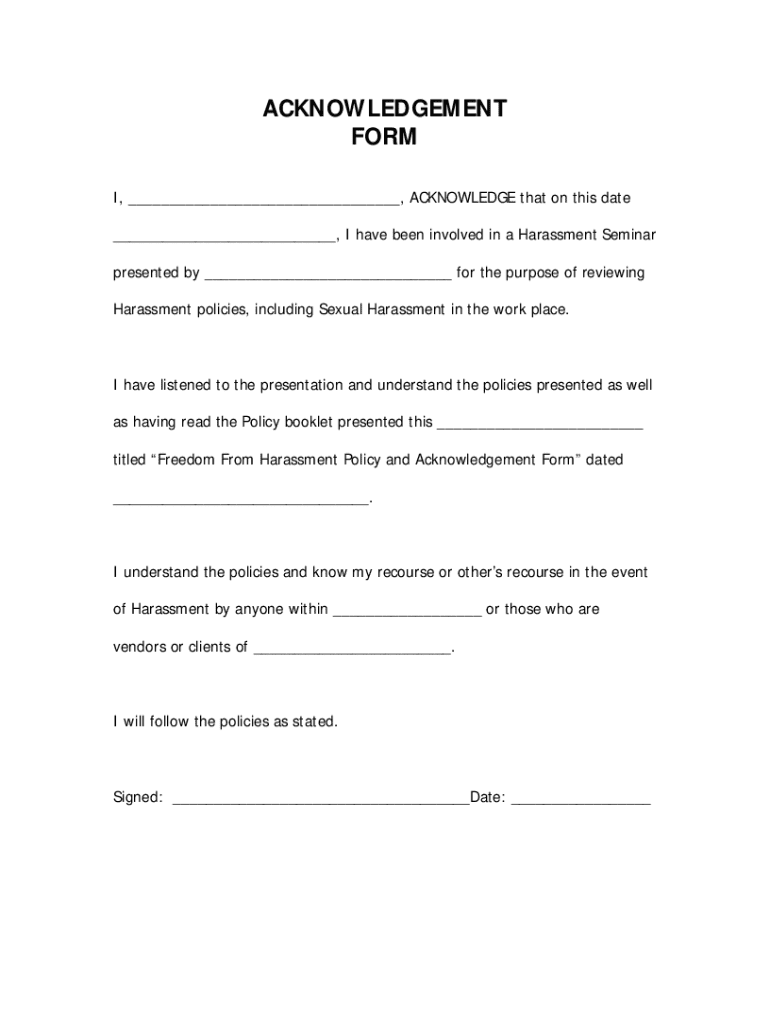Get the free Employee Acknowledgment Form for Harassment Training - Workplace