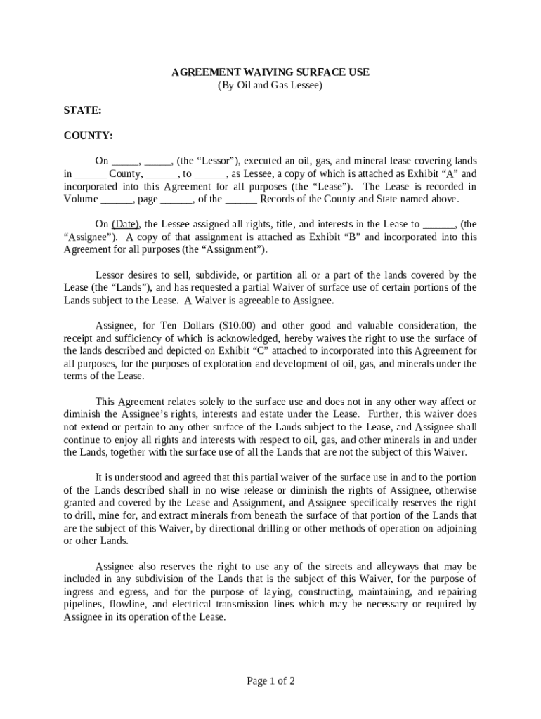 An agreement waiving surface use is a legal document that allows a property owner to relinquish their rights to surface usage of land while retaining subsurface rights.