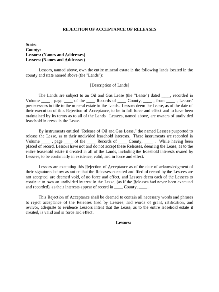 Typically, a rejection of acceptance form includes sections for Lessors, Lessees, and essential details like Land Descriptions. Each part serves a specific purpose in clarifying the terms of rejection and ensuring that the parties' intentions are accurately documented.