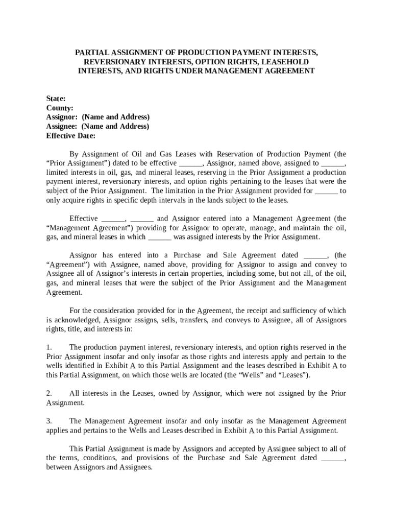 This is a form of a Partial Assignment of Production Payment Interests, Reversionary Interests, Option Rights, Leasehold Interests, and Rights Under Management Agreement.