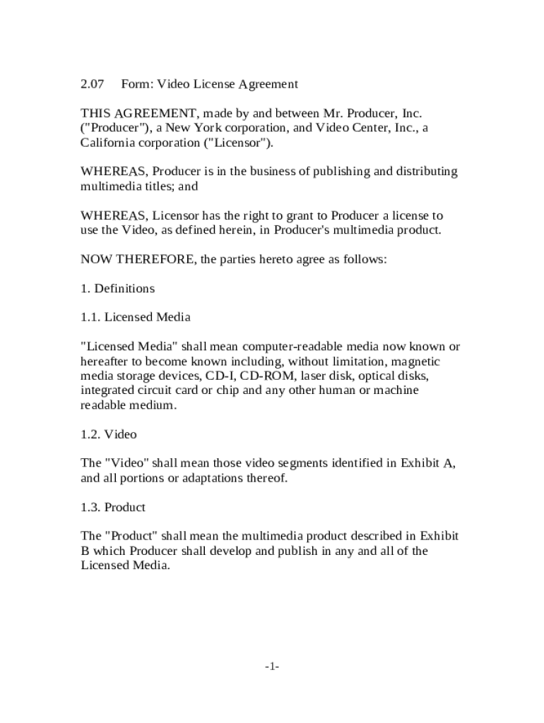 This is a model contract form for use in business settings, a Video License Agreement. Available for download in Word format.