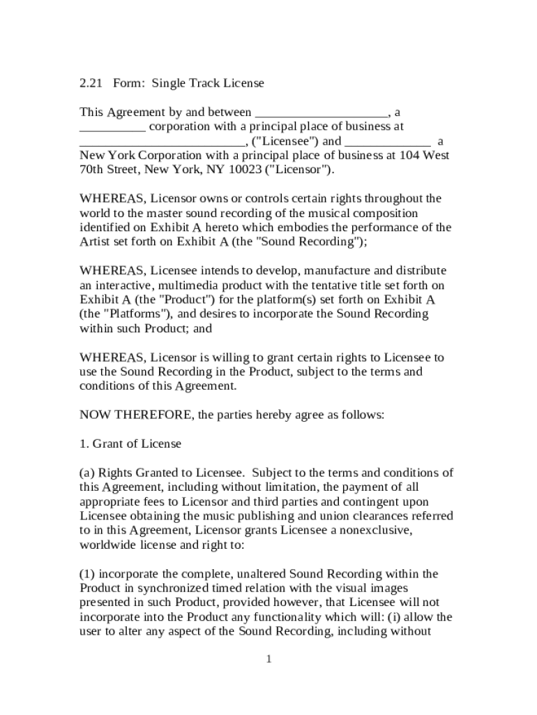 This is a model contract form for use in business settings, a Single Track License. Available for download in Word format.