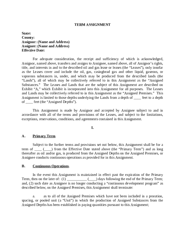 This is a form of Term Assignment The Assignor transfers and assigns to an assignee, all of the assignor_x0019_s rights, title, and interests in and to the described oil and gas lease or leases.