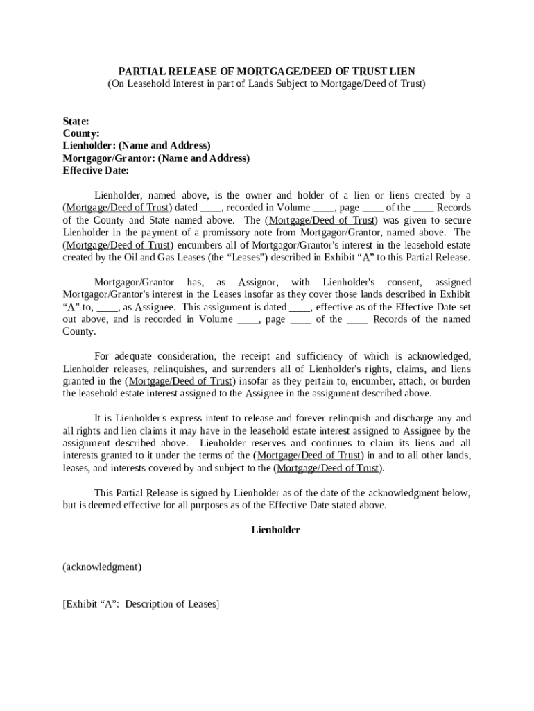 Get the free Partial Release of Mortgage / Deed of Trust Lien on Leasehold Interest in Part of La...