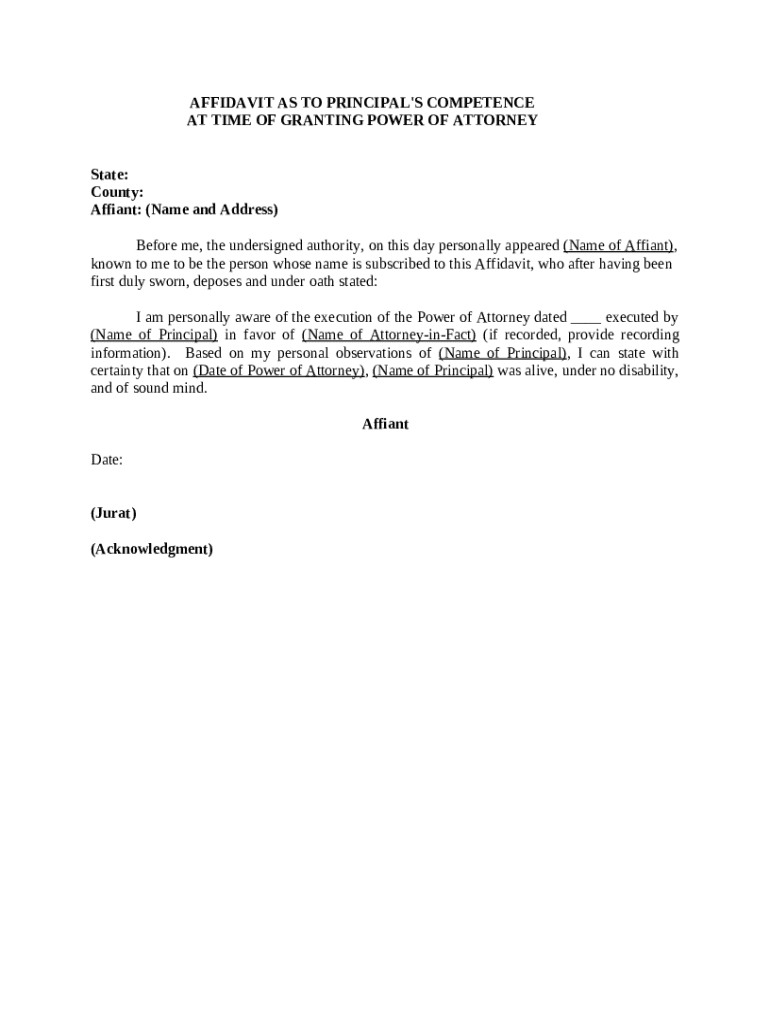 Get the free Affidavit as to Principal's Competence at Time of Granting Power of Attorney template