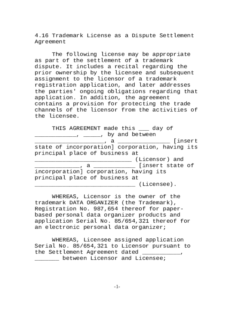 Get the free Trademark License as a Dispute Settlement Agreement template