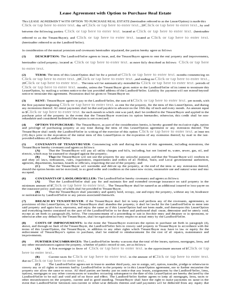 This is a sample Lease Agreement with an Option to Purchase Real Estate. A lease purchase agreement between a tenant and a landlord allows the renter the option to eventually buy the property. Additionally,