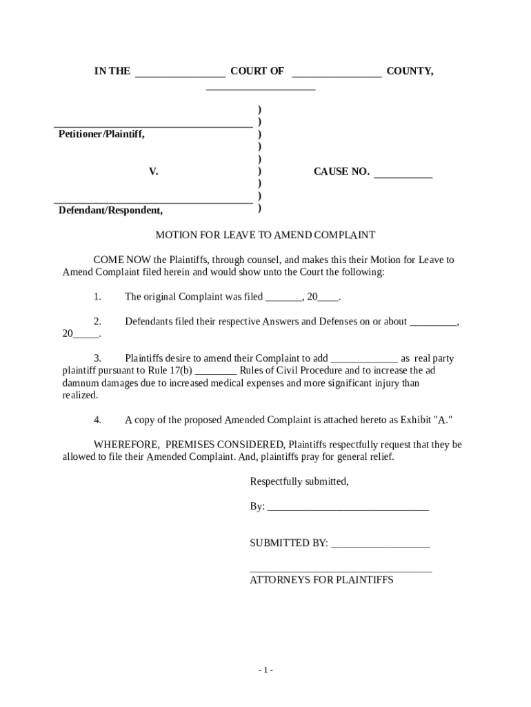 Get the free Motion for Leave to Amend Complaint to Add Party and to Increase Damages template