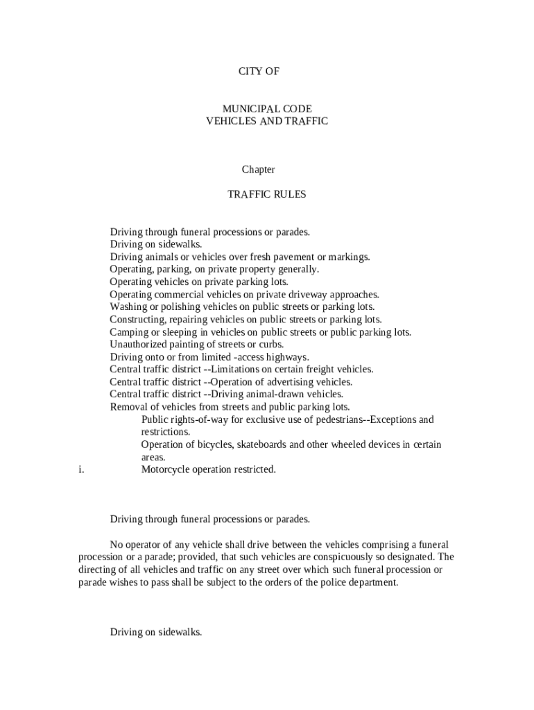 This is a sample of Municipal Codes when dealing with vehicles and traffic. This may be used across the United States.