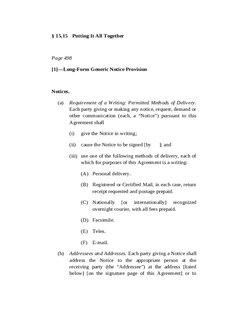 This form brings together several boilerplate contract clauses that work together to establish the requirements, procedures, and effectiveness of notice given under the terms of a contract agreement.