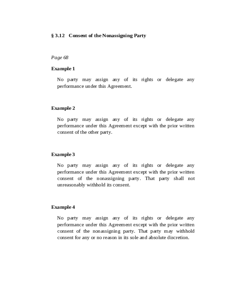 This form provides boilerplate contract clauses that outline consent requirements for any assignment or delegation of rights under a contract. Several different language options representing various