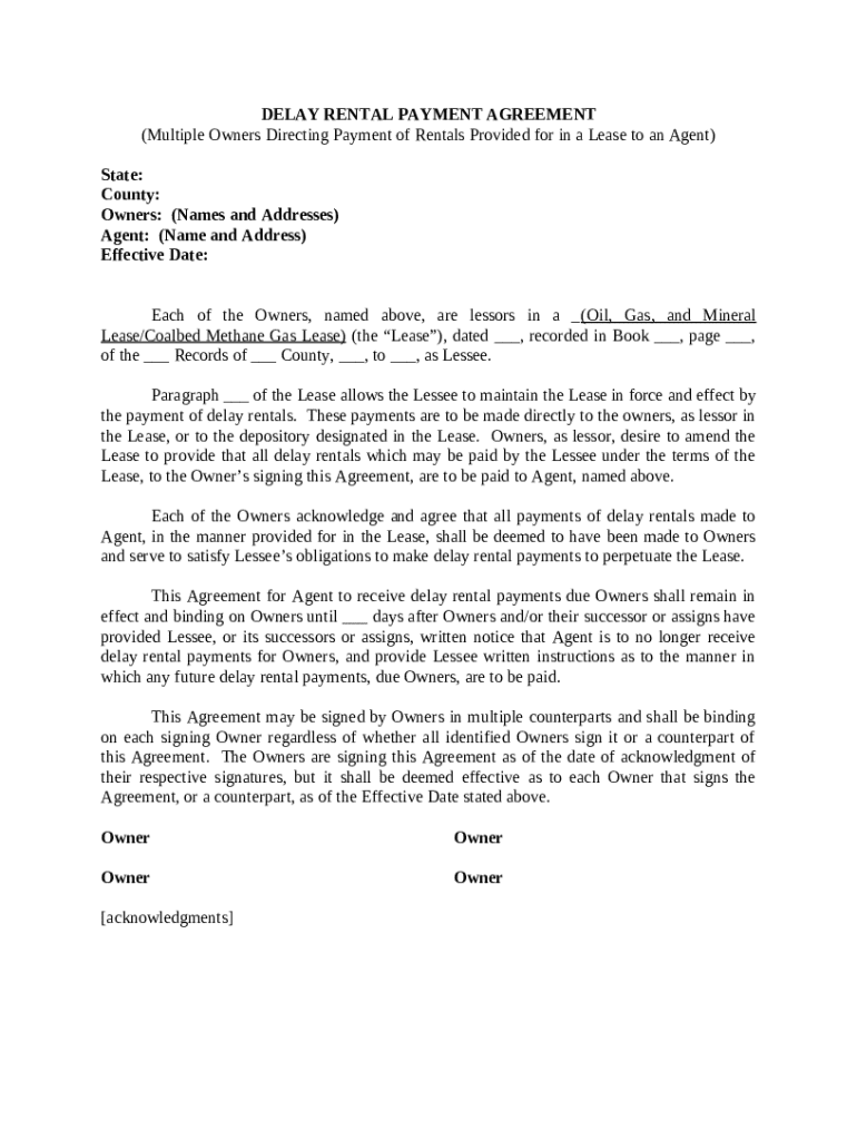 A delay rental payment agreement outlines the terms and conditions under which rent payments can be deferred, typically within oil, gas, and mineral leases. Understanding the significance of delay rental payments is crucial for both lessors (property owners) and lessees (renters). These payments ensure continued interest in a lease, safeguarding the lessor's investment while allowing lessees a flexible payment timeline.