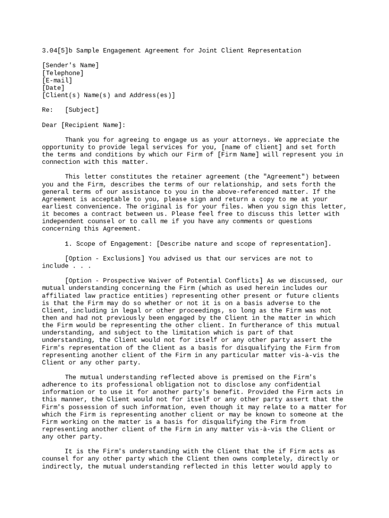 This is an engagement letter for joint client representation. It covers the nature and scope of the representation, any exclusions, potential conflicts of interest, retainer, fees, costs and expenses,