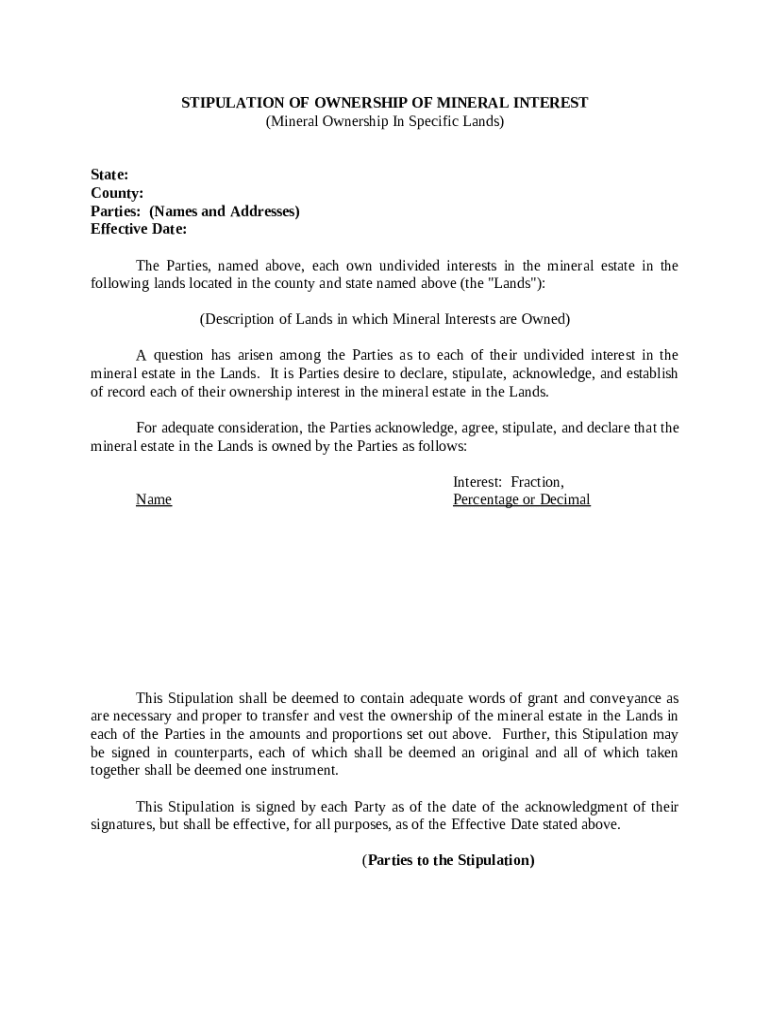 This stipulation form is intended to be executed by parties, all of whom own undivided mineral interest in specific lands, to clarify/specify each party_x0019_s undivided interest.