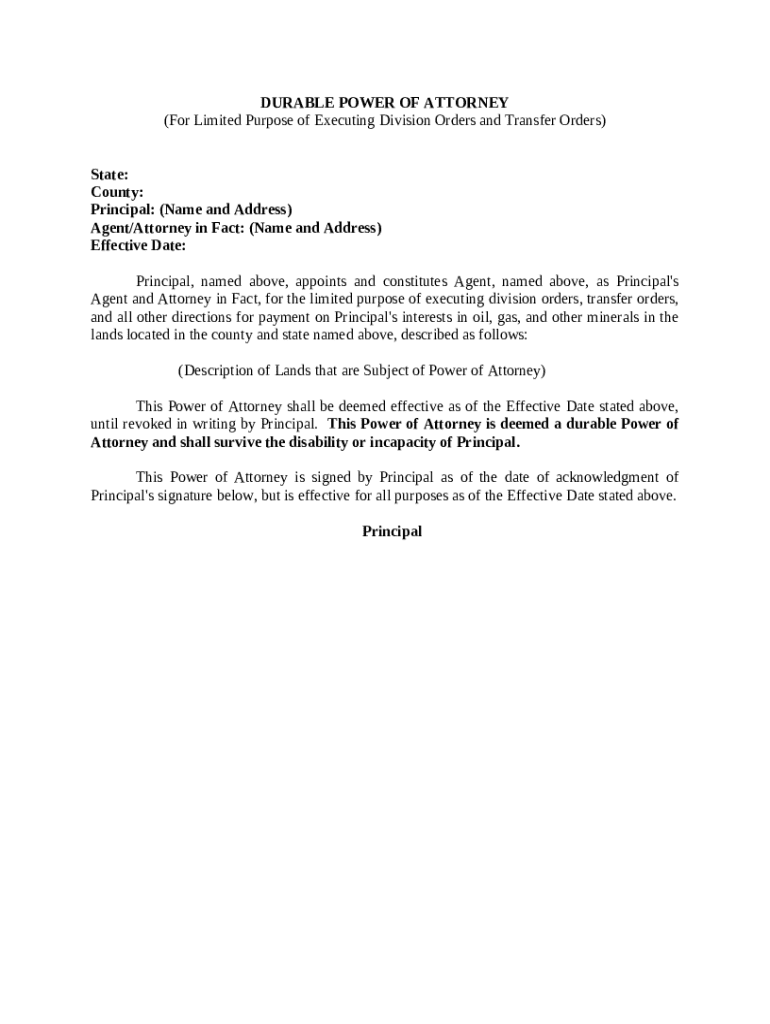 Get the free Durable Power of Attorney For Limited Purpose of Executing Division orders and Trans...