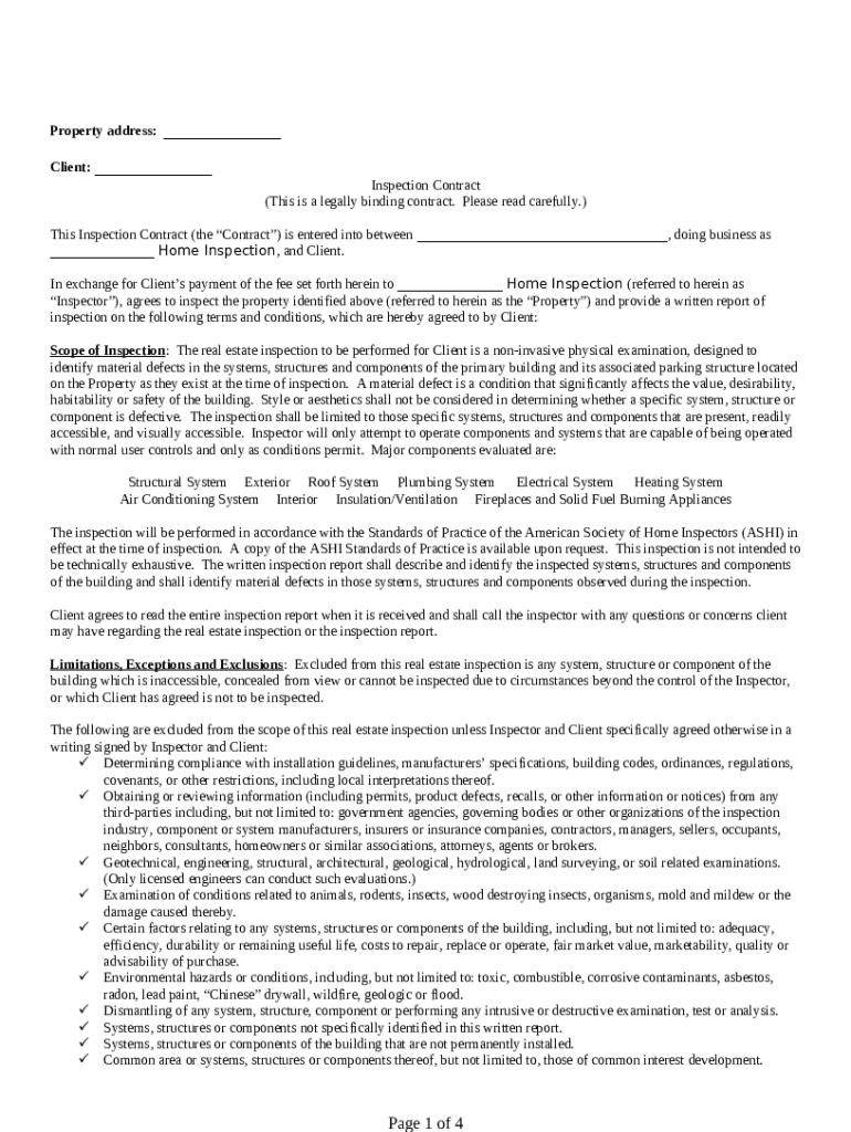 An inspection contract is a legal agreement that outlines the terms between the inspector and the client. Its primary purpose is to protect both parties by clearly defining the scope of the inspection and the responsibilities of each party.