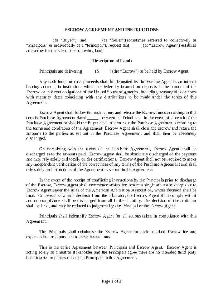 An escrow agreement and instructions is a legal document that outlines the terms and conditions under which an escrow agent will hold and manage funds and/or documents until certain obligations are fulfilled.