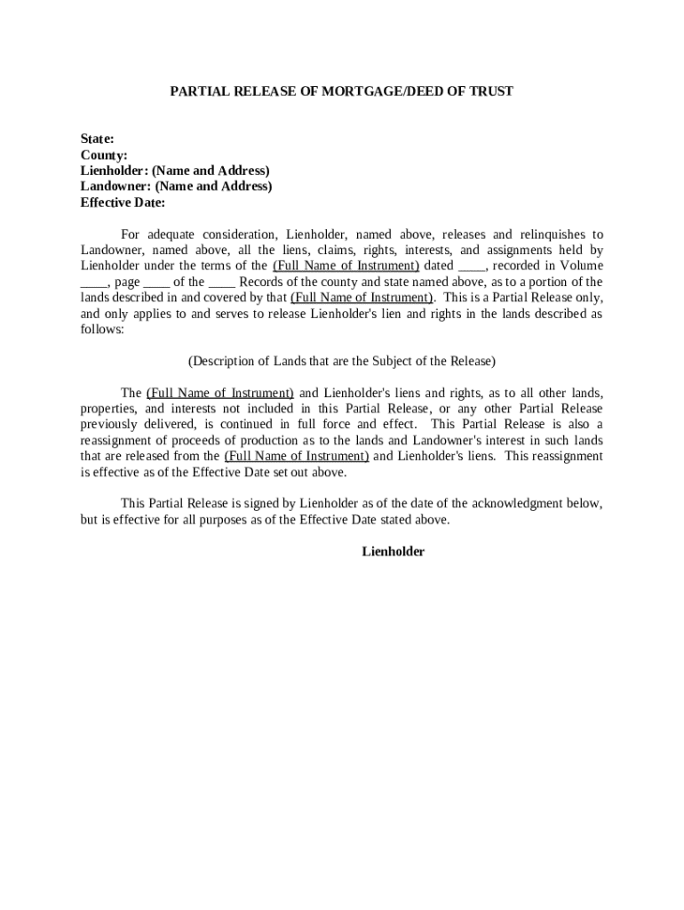 This form provides for a partial release of a mortgage/deed of trust on lands.