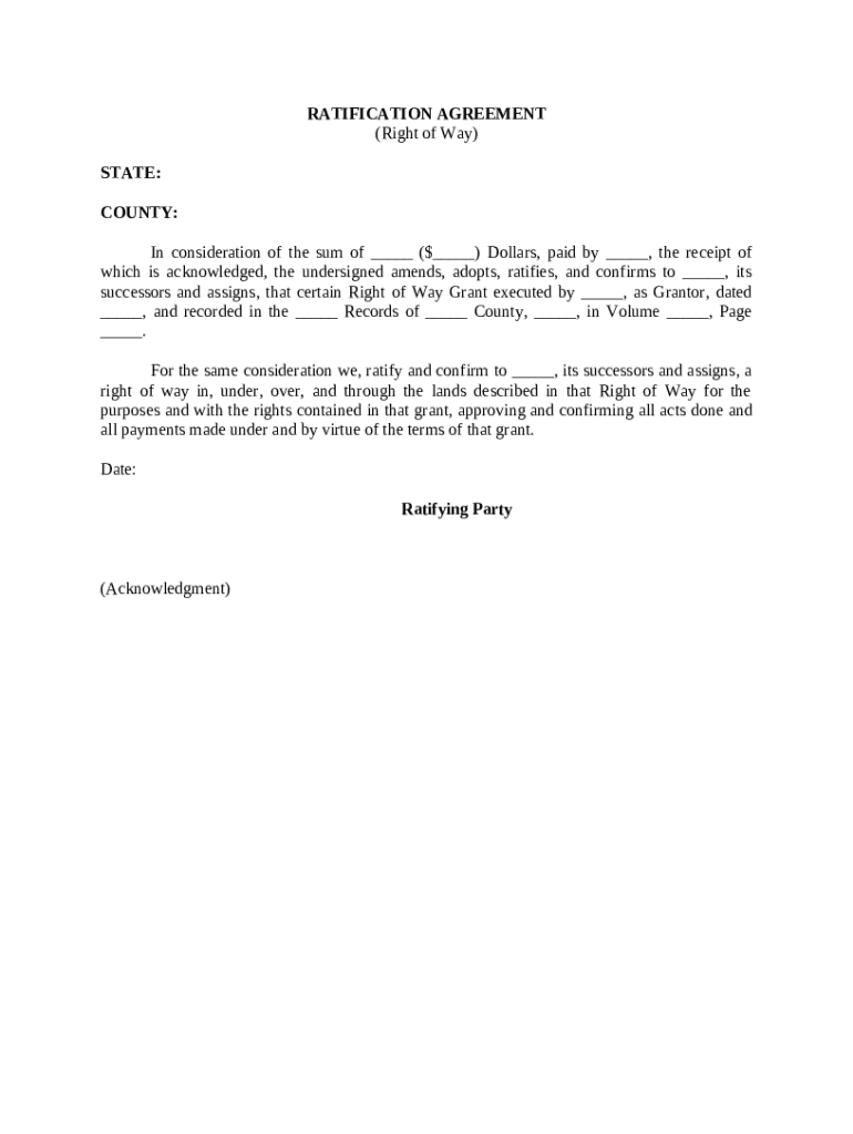 A ratification agreement right of is a legal document that formalizes approval of rights or obligations under an existing agreement.