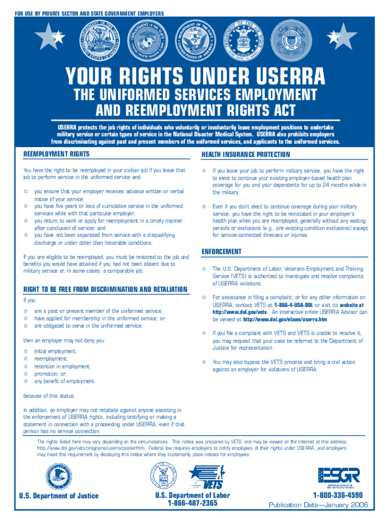 An approved copy of the Uniformed Services Employment and Reemployment Rights Act is made available for informational purposes or for employers to use as posters.