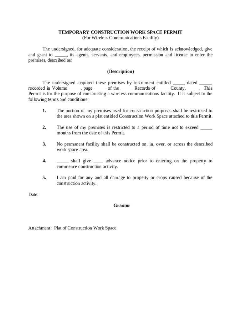 Get the free Temporary Construction Work Space Permit (For Wireless Communications Facility) temp...
