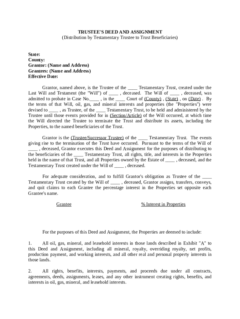 Get the free Trustee's Deed and Assignment for Distribution by Testamentary Trustee to Trust Bene...