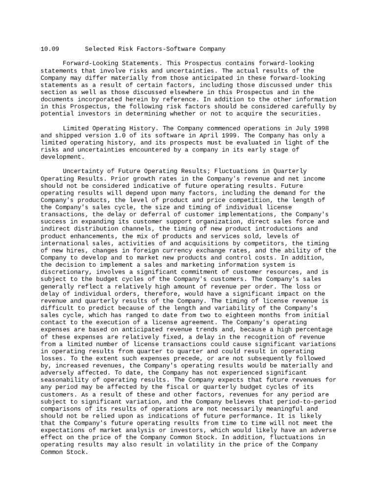 This Prospectus is a document with forward-looking statements that are meant as a means of informing prospective investors of the risks associated with investing in a software company. It addresses