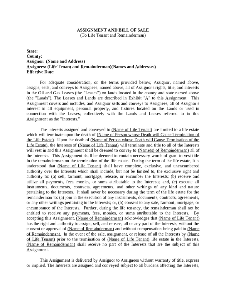 Get the free Assignment and Bill of Sale to Life Tenant and Remainderman template